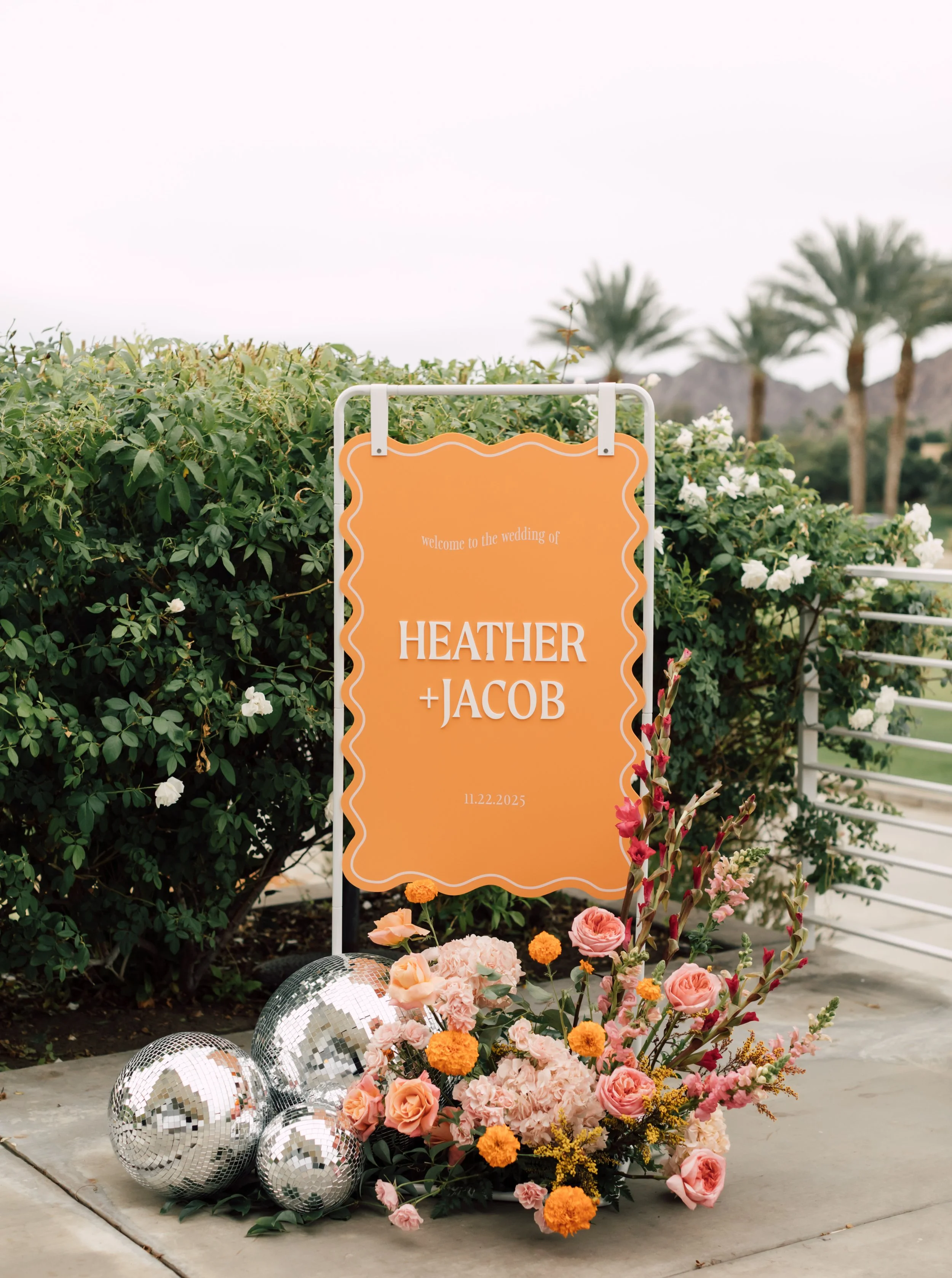 The celebration truly came alive as guests moved into cocktail hour and the reception, where every detail felt joyful, bold, and unapologetically fun. Bright orange signage greeted everyone with instant energy, setting the tone for a night that was vibrant, playful, and full of personality. Inside, the space glowed with warm pinks, oranges, yellows, and lush greens, blending vintage Palm Springs charm with effortless mid-century modern style. Disco balls hung overhead and nestled among florals, catching the light and scattering it across the room as the dance floor filled. With a classic black and white floor beneath their feet and Old Hollywood sparkle all around, the night turned into nonstop movement, laughter, and celebration. It was the kind of reception where the music pulled everyone in, the colors felt alive, and the dance floor stayed full