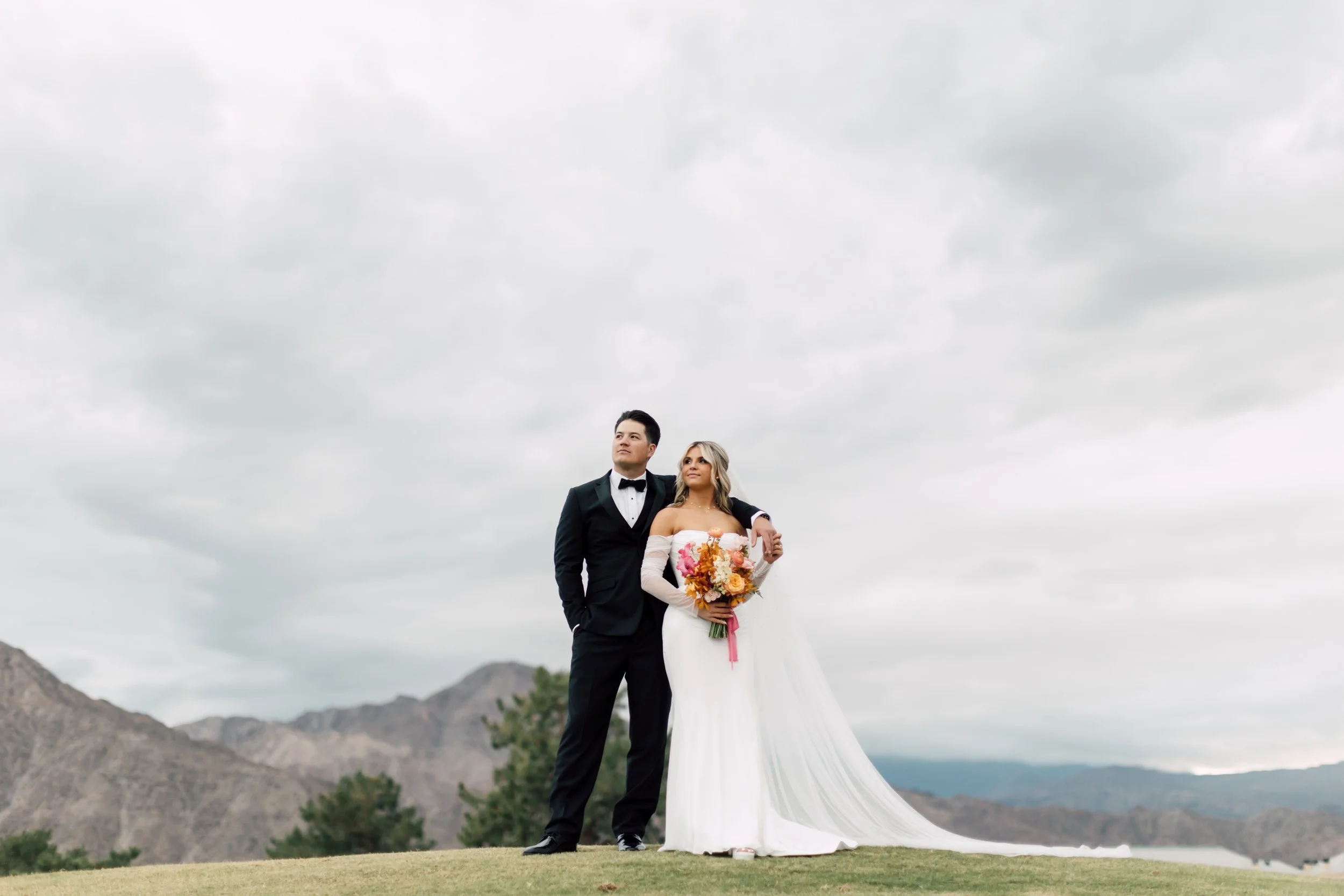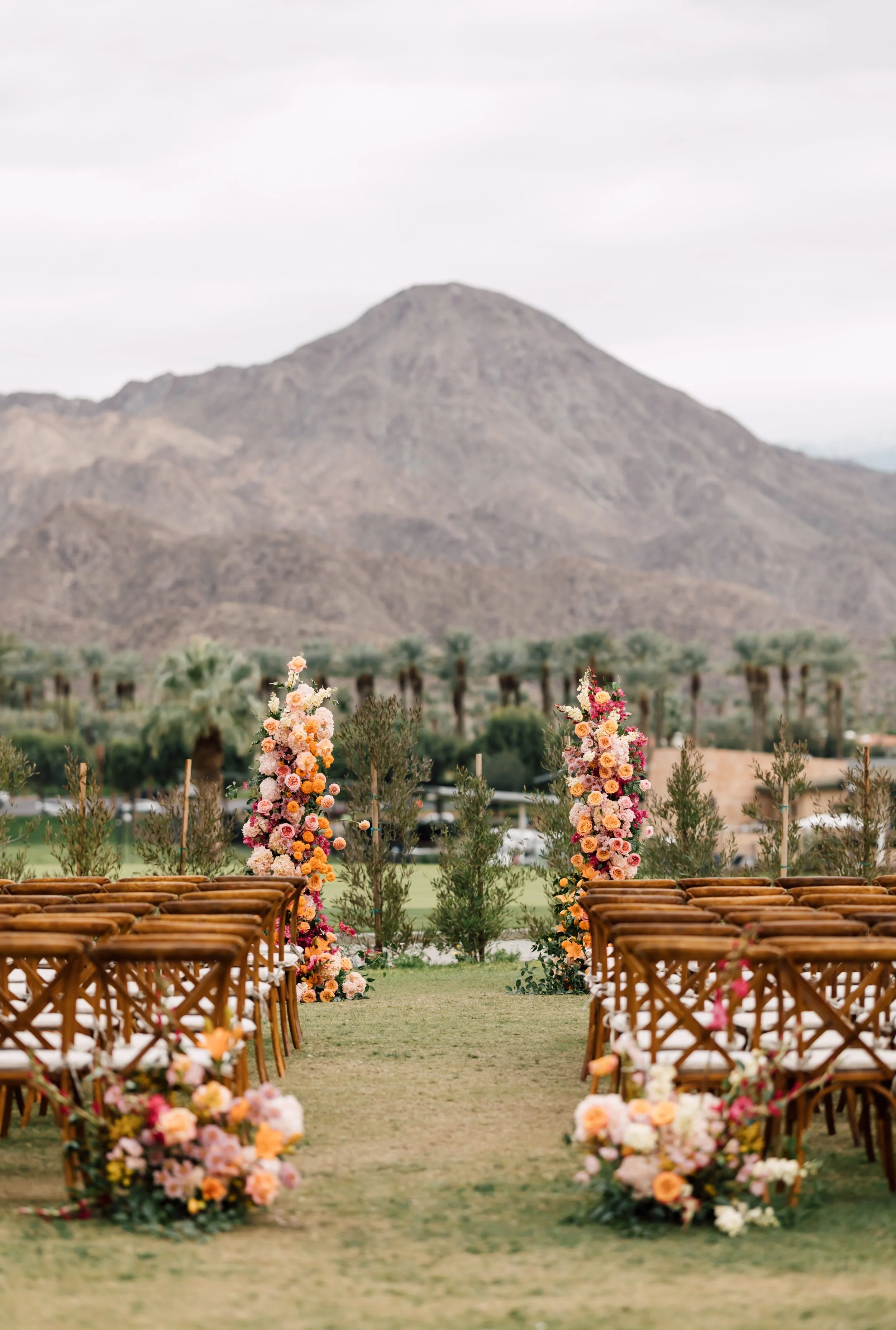Set beneath the quiet presence of the desert mountains, their ceremony felt calm, intimate, and deeply intentional. Rows of warm wooden chairs led guests down a grassy aisle framed with overflowing florals in soft peach, blush, and coral tones, adding a gentle warmth to the desert landscape. Two floral pillars stood at the altar, effortlessly drawing the eye while still allowing the sweeping scenery to shine through. As the palms swayed in the distance and the mountains stretched beyond them, the moment felt grounding and peaceful. It was a ceremony rooted in beauty, connection, and the quiet magic of the place they chose to begin their forever.